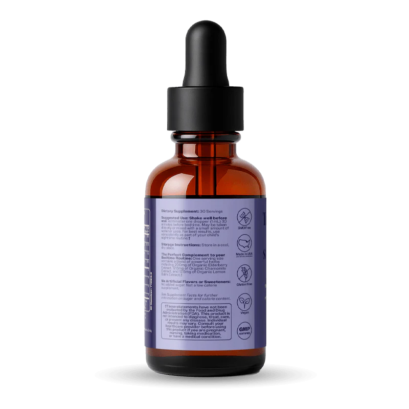 Every drop of our Kids Sleep Drops contains Melatonin, Vitamin B6, Organic Elderberry, Chamomile & Lemon Balm.*