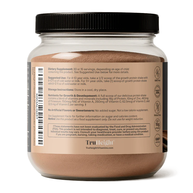 - Plant & Whey Options: TruHeight Growth Protein Shake offers 16g of protein per serving. Both options include essential vitamins like A, B, C, D, calcium, and zinc to support bone health, immune function, and energy metabolism, all with only 2g of sugar per serving.*